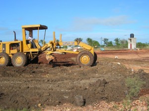 The grader operator was up and running by 7:00 a.m. and now it is noon, he has the makings of a field in front of me. I staked off an area 210 feet long x 120 feet wide this morning when he started and he has been doing a great job so far. In the background, you will see the makings of our pump house. I pre-ordered a well to be drilled so we could draw water for our Toro irrigation system. I was hoping for a drilled well and a well head but in the Dominican, every well comes with a concrete building and a tank on top for gravity feeding water when the power is out (70% of the time, there is no electricity).